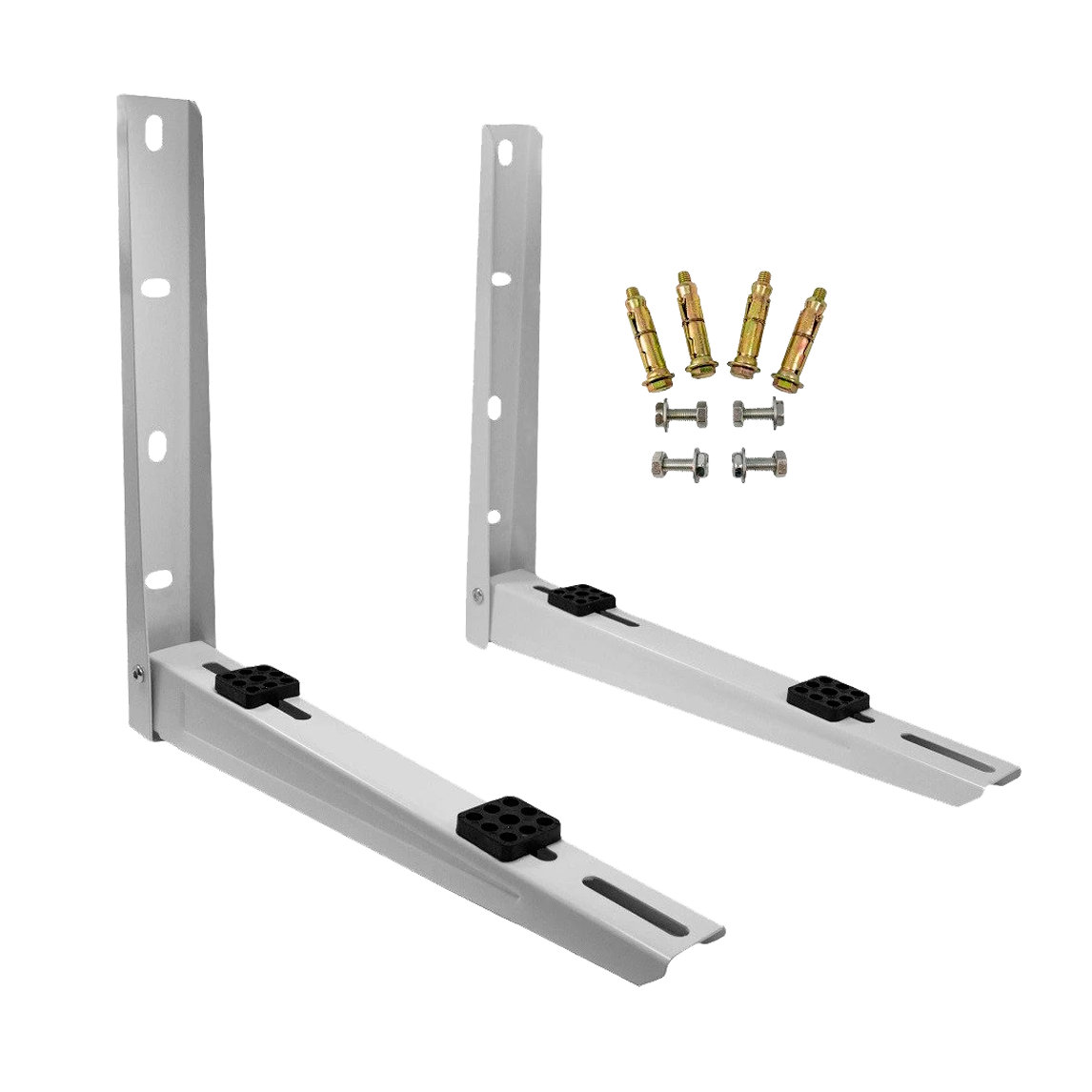 Folding, heavy gauge steel condenser bracket kit, for wall installations. Use on all Models of Mini Split Condensing Units. Heavy gauge galvanized steel structure with electrostatic epoxy paint. Packed with all required hardware, including 4 concrete expansion bolts. Heavy Duty Steel Construction, Galvanized and Epoxy Painted. Includes all hardware for attaching the condenser plus 4 expansion bolts for wall mounting. 4 Rubber vibration absorbers also included. Multiple sizes to choose from. Pick the bracket that fits the BTU output of your machine. Raises the condensing unit above floor for protection from dirt, snow, debris, floods and other perils.